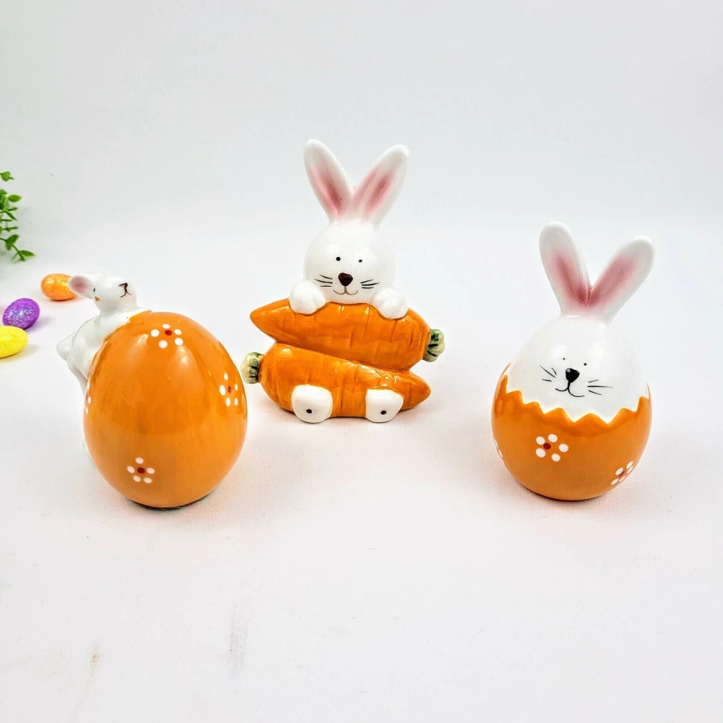 Kit com Dois Ovos de Porcelana com Coelho e Coelho de Porcelana com Cenoura Decorativo - A Elegância da Páscoa em Cada Detalhe